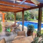 The house was built for the use of the owners, therefore using the best quality hardwoods, natural stone floors, bricks and many more details. All ceilings are high and have precious natural hardwoods, including the stairs and some floors. Two fireplaces. Lots of light, open-style home, with large modern gourmet kitchen. The huge master bedroom is private, on one side of the house, with its own sitting area, fireplace, walk-in closets, and views of the gardens. Two other bedrooms and bath on the other side of the house, with stairs up to the office with views. Separate laundry room with possible maid’s room. Covered garage for 3 cars, and parking for many more.