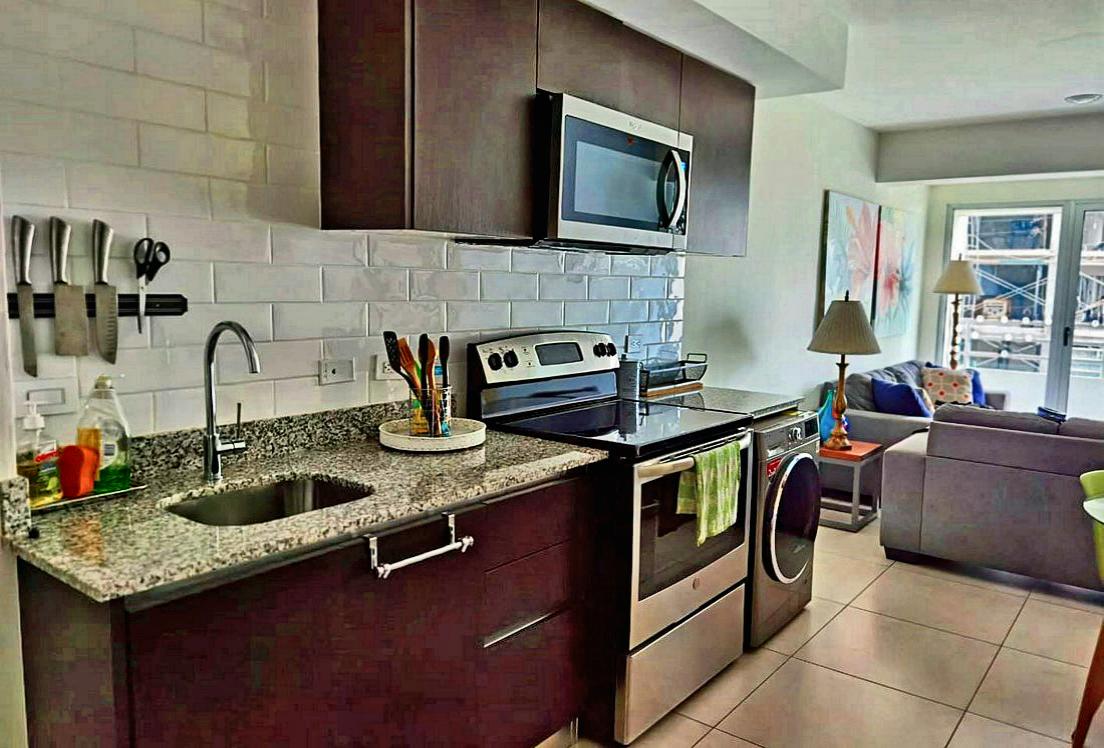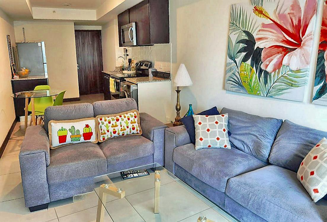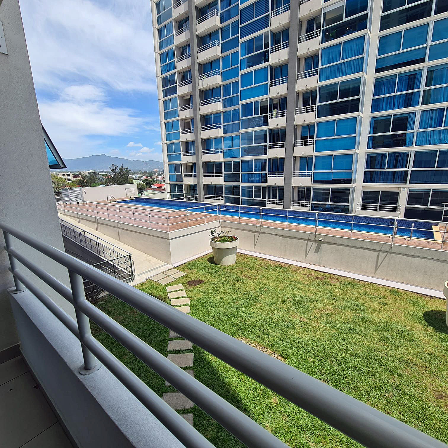 Condominium Torres Los Yoses, San Pedro, San Jose (Costa Rica) – Lovely 47-m2 (500-ft2) apartment for sale with living area open to the kitchen, 1 bedroom with walk-in closet, 1 bath, and balcony. The apartment is located on the 5th floor (of Tower A) on the southwest corner. The bedroom is very comfortable, with an area where you could put a desk.
