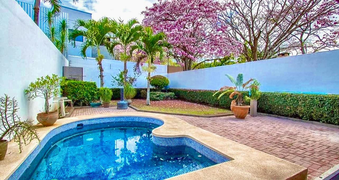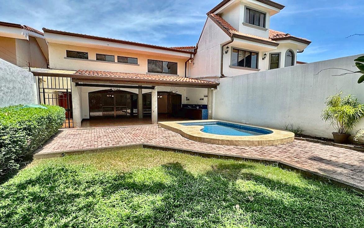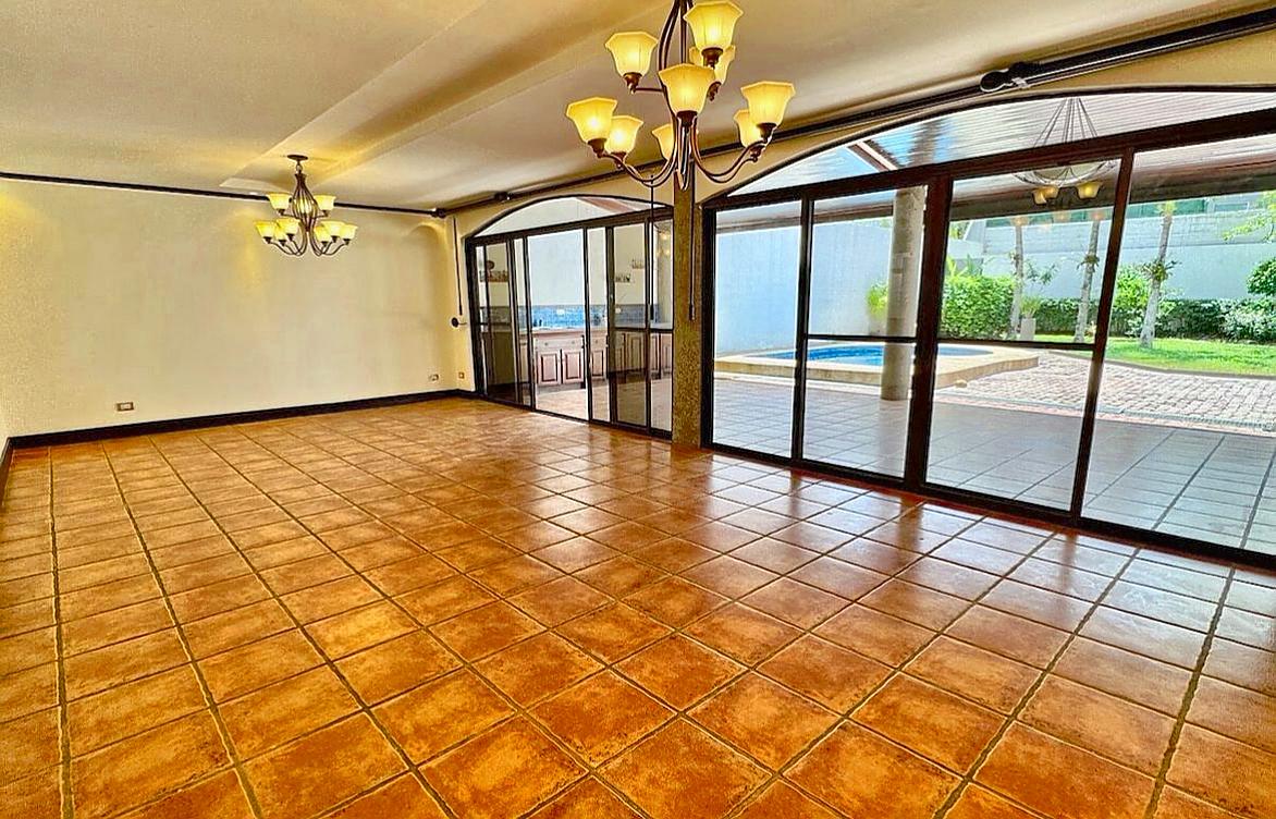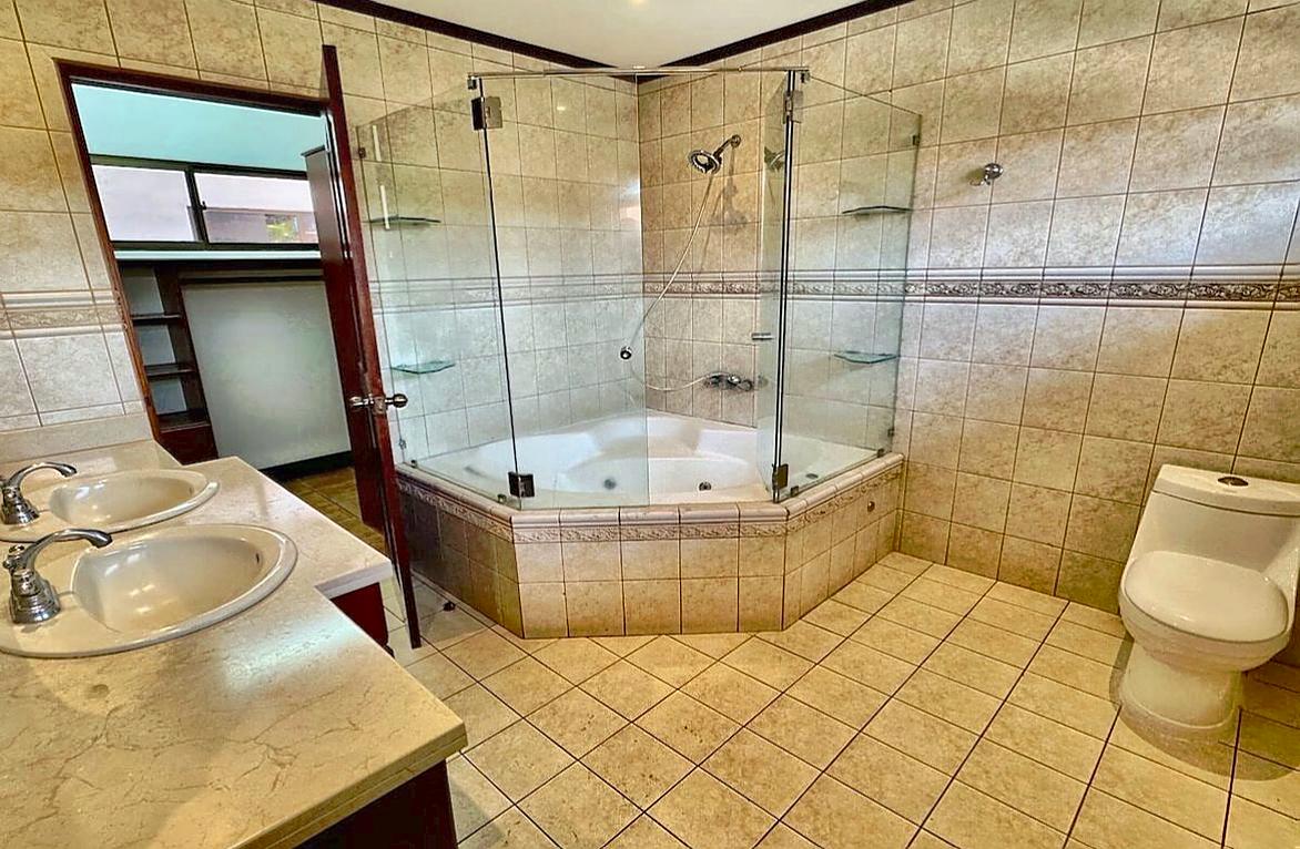 Condominium Praderas del Sol, Pozos, Santa Ana (Costa Rica) – Spacious, bright house for sale with a private garden and pool. Excellent location near Escazú, with access to Highway 27 through Villarreal. The 320-m2 (3,445-ft2) house, on a 360-m2 (3,900-ft2) lot, has 3 bedrooms, 3.5 baths, and a maid’s room. Built in 2005.
